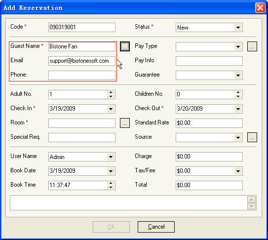 Dialog, guest name, phone and email